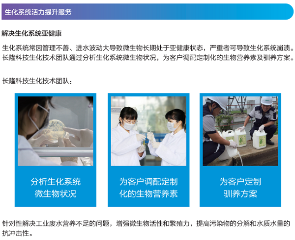 長隆科技庫巴魯®水處理生化技術服務團隊由3名博士后、5名碩士及數十名工程師組成。專業的團隊、精準的水質分析,長隆科技能夠針對客戶水處理的需求,定制個性化的生化方案,為客戶穩定生化系統、改善微生物活力、提升處理能力。