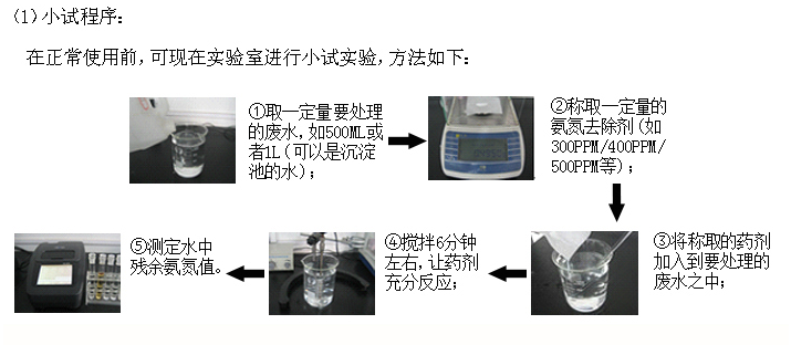 4、試驗室試驗:水溫要求在35—45C°,含氮污水PH調整至11.5后,投放高效除氨氮劑,藥劑投加量50—70ml/噸污水,曝氣2小時,曝氣量:如在500ml燒杯曝氣,曝氣量控制在0.75立方米/小時。