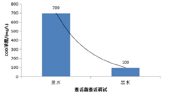 我司技術人員通過現場評估,發現現場生化系統處理效率低下,好氧池內有效生物量嚴重不足,導致系統處理能力有限,在前端及后續藥劑大量使用的情況下出水COD仍難以達標。通過我司現場投加激活菌301,配合現場生化系統運行條件控制優化,達到如下效果: