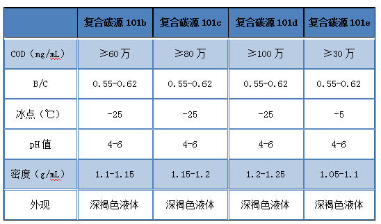 復合碳源101b,c,d,e系列:無色度,不發酵,冰點低,有效COD含量高,常規款產品為60萬、80萬、100 萬,也可私人訂制此范圍外的產品。