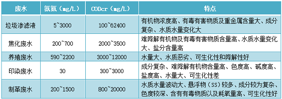 高氨氮廢水處理,由于工業廢水來源廣泛,水質復雜,對于不同行業的廢水水質情況經常會面臨不用氨氮的去除難題,常見的幾類廢水水質及特點見以下表格: