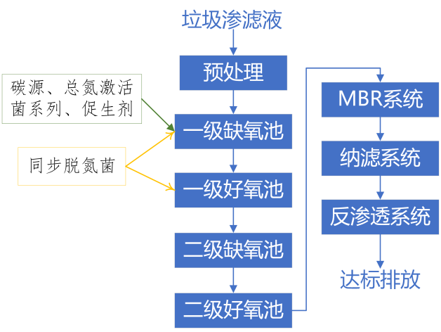 垃圾滲濾液生化處理常用A2O2 +MBR工藝,其中MBR工藝出水水質(zhì)較好、各污染物去除率較高,因此應(yīng)用最廣。但是生化處理常用碳源以甲醇、葡萄糖居多,此類碳源成本高、性價比低,且甲醇易燃、有毒,存在安全隱患,葡萄糖安全性高,但投加不便、易導(dǎo)致污泥膨脹。而且垃圾滲濾液鹽度較高,對耐鹽能力差的微生物而言處理難度大。