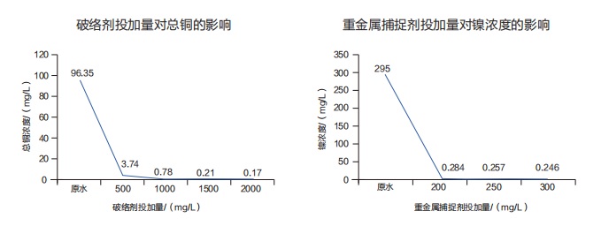 該客戶采用二級沉淀+重捕池+生化工藝,出水總銅、總鎳、總磷、總氮等均超標。經診斷,在混凝池前端、重捕池前端和后端加入系列配套藥劑,水中銅含量降至0.21mg/L、鎳含量降至0.25mg/L、總氮穩定于15.00mg/L,均能達標排放,出水穩定,成本更低。